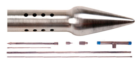Gas Vapor Dedicated Points are now used around the world for monitoring remediation of hydrocarbon spills, tank & pipe leakage, landfills, & at hazardous waste sites. Soil gas monitoring with the Gas Vapor Dedicated Point is easily accomplished. The unique design of the dedicated stainless steel vapor point, with a Teflon umbrella & optional screen to prevent soil from clogging the vapor inlet holes, or for groundwater sampling, ensures a representative sample time after time. Teflon tubing is used to transfer the sample to the surface. The Gas Vapor Probe is normally supplied as a complete system kit form with all the items needed to efficiently install the dedicated points in most penetrable soils.